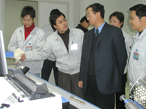 在公司总经理薛冬泉等领导的陪同下,徐文英会长参观了产品陈列室和科研所、生产线,观看了《开云体育官方网站走向世界》宣传片,听取了总经理薛冬泉对开云体育官方网站的发展历史、目前的生产经营状况以及未来发展思路的汇报,特别了解了正在建设的开云体育官方网站工业园区的建设规划、“十一五”发展规划等情况。
