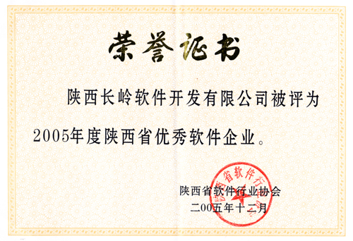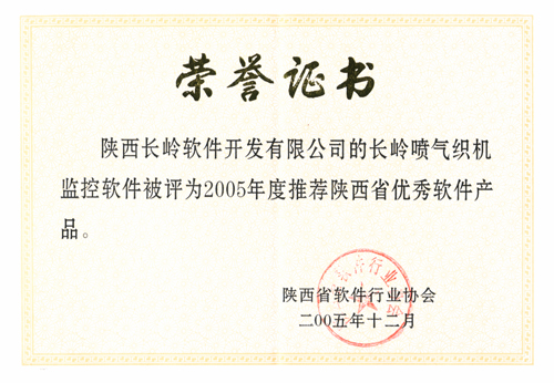 2006年1月12日,在陕西省软件产业工作会议暨省软协一届五次会员大会上,公布表彰“2005年度优秀软件企业”、“2005年度推荐优秀软件产品”、“2005年度陕西省优秀软件人才”,我公司被授予陕西省优秀软件企业荣誉称号,纺研所设计员李永红被评为陕西省优秀软件人才、长岭喷气织机监控软件被评为陕西省优秀软件产品。