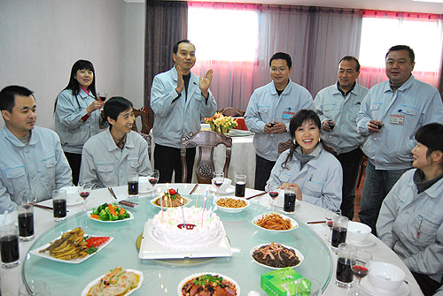 公司坚持人性化管理,把员工的利益作为头等大事。为增强员工的凝聚力,让员工感受到公司大家庭的温暖与关怀,自今年开始,公司为所有员工在每周一集中为当周生日的员工举办生日聚会,庆祝生日。在元月10日的生日酒会上,公司后勤部精心准备了8个凉菜、8个热菜、生日蛋糕、水果和红酒,点燃生日蜡烛,唱起生日快乐歌。公司领导和各部门领导,也来到生日聚会上,一一向过生日的员工敬酒祝福。公司给员工过生日,不仅营造了和谐的企业文化,而且也凝聚了人心。参加生日聚会的员工深受感动,他们说,公司为员工过生日事小意义大,让我们在其中感受到家庭般浓浓亲情。