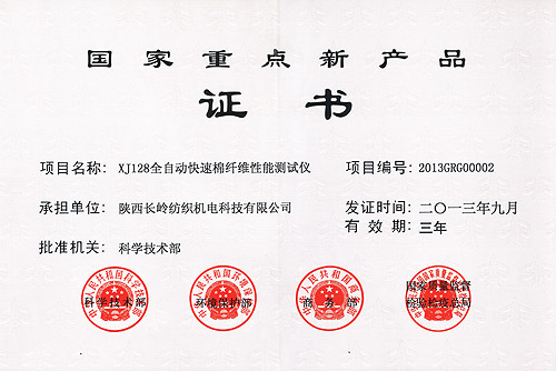 经过申报,省级初审,国家答辩评审,公司自主研发的XJ128快速棉纤维性能测试仪被认定为2013年度国家重点新产品,同时被列入2013年度国家重点新产品计划(有效期三年)。公司获得由国家科技部、环保部、商务部及质检总局联合颁发的“国家重点新产品证书”,同时作为择优对象获得新产品研发补助。