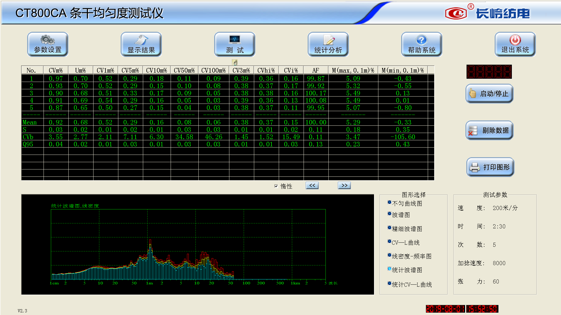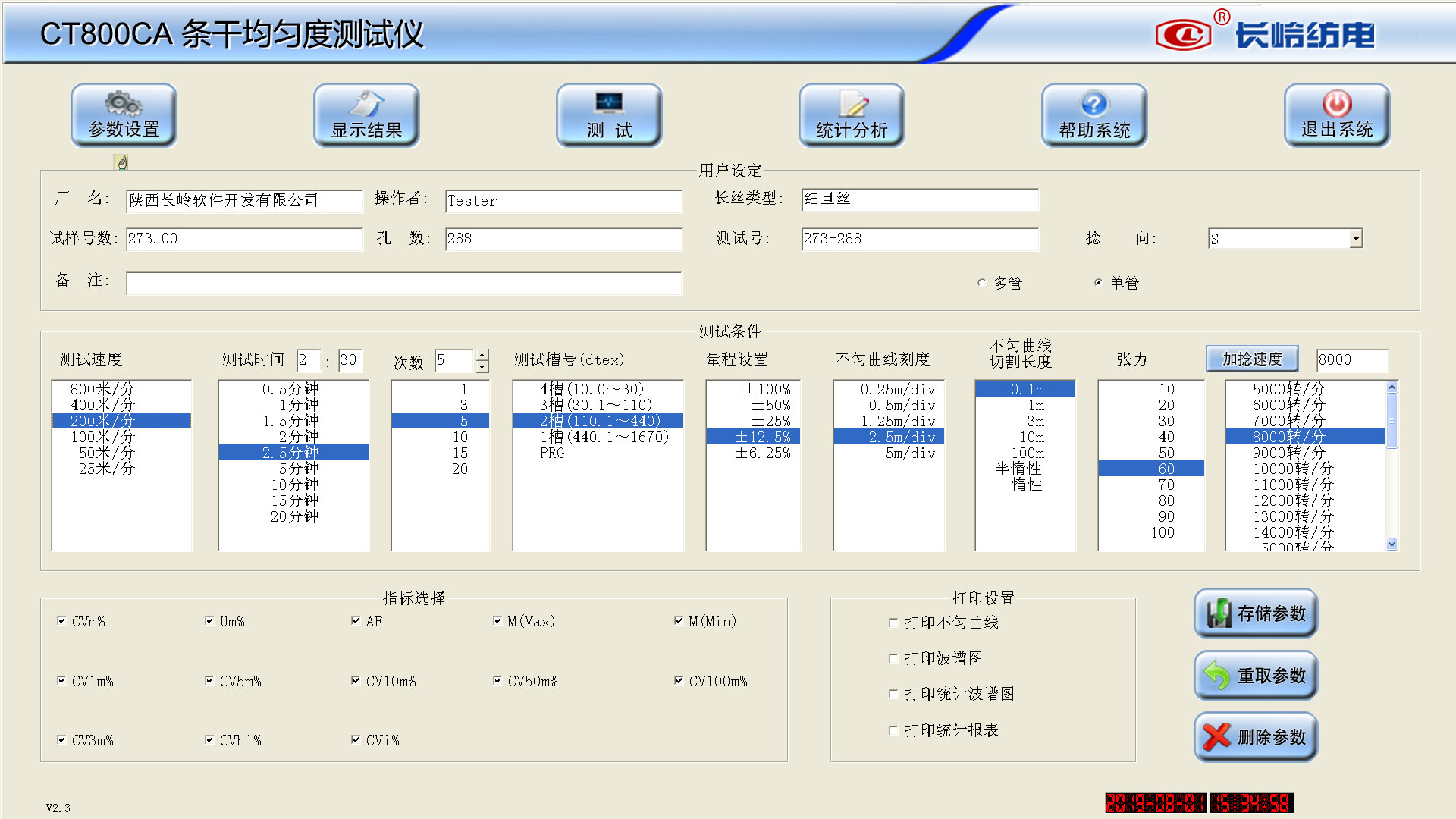 CT800CA条干均匀度测试分析仪是一种测试和分析化纤长丝条干不匀程度、考核化纤长丝质量、指导长丝生产的高精密仪器。该仪器全自动测试,测试信息丰富,能提供多项数据和图形指标评价纱线质量信息,十分有利于长丝生产企业过程控制和提高化纤长丝的质量。
