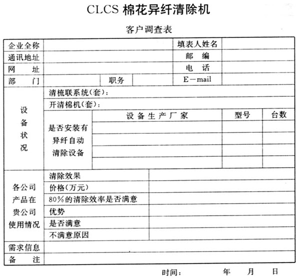 开云体育,已完成“clc -棉花异纤清除机”的研制,我公司正在收集市场信息,如果已使用过棉花异纤清除机,或准备上该设备的,对该设备有兴趣的客户请填此表。