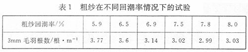 精纱回潮率在生产过程中牵伸纤维与纤维、纤维与机械表面之间相互磨擦容易引起纤维产生静电,当纤维间带有相同电荷时,由于同性电荷的相互排斥造成纤维之间互不抱合,从而引起纱条内的纤维端因为静电而外露,增加纱线毛羽。从物理学的角度我们知道纤维的比电阻与纤维的回潮率成负相关,而纤维的回潮率与其相对湿度成正相关,即生产环境相对湿度大,纤维的回潮率大,其比电阻相对则偏小。因此,我们可通过提高生产环境的相对湿度来增加纤维的回潮率,从而降低纤维的比电阻,增加纤维在生产过程中产生的静电荷的散逸速度,这样可以从很大程度上消除纤维上的静电,通过减小纤维间因静电原因的相互排斥而头尾外露,以达到降低毛羽的目的。表1是粗纱在不同回潮率情况下的试验对比。