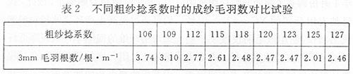 粗纱捻系数的大小对成纱的毛羽有一定程度的影响。粗纱捻系数偏小,粗纱在卷绕成形及运输过程中易出现发毛、表面不光洁,这样显露在粗纱表面的纤维越多则在细纱生产过程中产生毛羽的机率相对就越多。适当增加粗纱捻系数,同时减小其后区牵伸倍数,可以降低后牵伸区纤维的扩散程度,加强纱条内纤维之间的抱合力,让纤维须条在进入主牵伸区时留有一定的捻回,使粗纱表面光洁,对减少成纱毛羽有利。表2是不同粗纱捻系数时的成纱毛羽数对比试验。