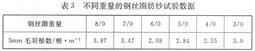 在环锭纺纱过程中,钢丝圈重量的配置将直接影响到纺纱张力的变化,而纺纱张力是影响成纱毛羽的重要因素。因为在整个卷绕成型过程中,纱线的卷绕张力时刻在发生不同的变化。钢丝圈重量的大小影响纱线张力的变化。如果配置的钢丝圈重量越轻,纱线张力就会越小,导致气圈形状过大,当管纱在底部时造成气圈碰撞隔纱板,使纱线毛羽增加;同时由于纺纱三角区的纤维捻系数收缩相对较差,会影响纤维的有效加捻和抱合,从而也会使纱线毛羽增加。反之,如果配置的钢丝圈重量越重,纱线张力就会越大,气圈形状则越小,当管纱在底部时造成气圈碰撞纱管顶部而造成纱线毛羽过多。同时由于钢丝圈重量重而出现磨灭早、使用周期短的现象。所以在选择钢丝圈重量时应慎重考虑,应通过试验纺纱来选择最佳重量的钢丝圈。表3是使用6903型号的钢丝圈在不同重量时的纺纱试验数据。