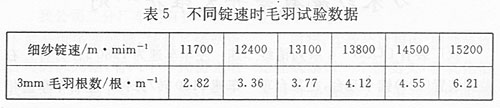 细纱锭速对纱线毛羽有较大的影响,从表4试验数据看出毛羽随细纱锭速的增大而大幅度的上升。所以在实际生产过程中应合理选择细纱锭速,不要一味追求产量而忽视产品质量,作为企业应权衡产量和质量的矛盾。表5是不同锭速时细纱毛羽测试数据。
