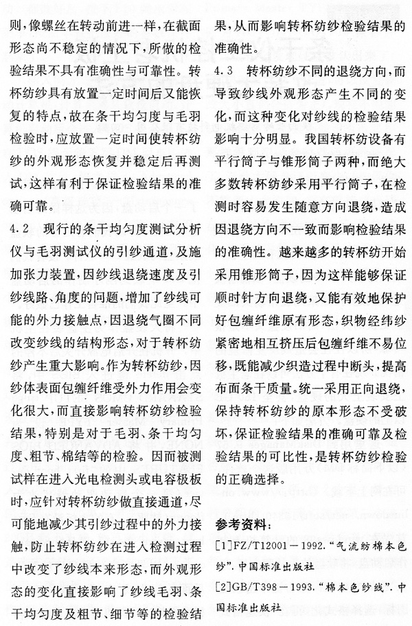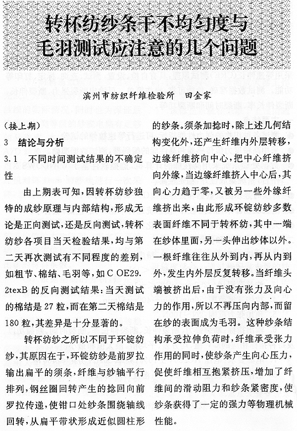 转杯纺纱条干不均匀度与毛羽测试应注意的几个问题