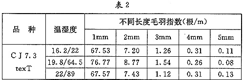 3.小结,从表2可以看出,各品种在不同的温湿度条件下,毛羽检验结果具有明显的差异,由随温湿度上升毛羽数量增长的,也有随温湿度上升毛羽数量减少的,也有随温湿度上升毛羽数量先上升,后减少的,不同品种纱线毛羽的变化随温湿度不同具有不同的变化趋势,且这种变化趋势,毛羽长度不同,其变化趋势也有所不同。这是因为不同的品种,其用途不同,生产工艺不同,其所用纤维的品质也有所不同,以棉纤维为例,不同线密度与不同用途的纱线,其配棉不同,这些不同包括纤维品级、长度,成熟度、强力、短纤维含量等均有所不同,导致这些纱线产生的毛羽在温湿度变化时,因上述因素的不同,其毛羽变化呈现不同的变化规律。