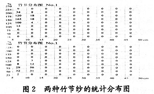 作为一种特殊的纱线,我们无法用常规纱线的测试指标来考核评价竹节纱,测试竹节纱的CVm %值一般很大,竹节纱的竹节长度远远超过了常规条干仪所定义的疵点范围,正常的测试指标对于控制竹节纱质量根本没有意义,需要探讨一种新的竹节纱质量控制方案。