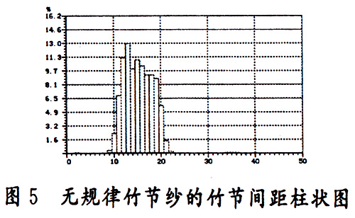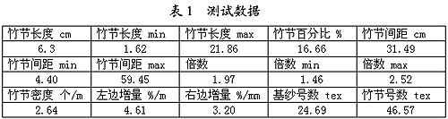 将所测试的图形和指标与该竹节纱的工艺参数相比较,发现竹节长度,竹节间距,竹节密度,倍数、基纱号数,竹节号数等测试指标与设定的工艺参数基本吻合,在散点图上,绝大部分散点位于竹节长度6.3厘米,倍数197%为中心的区域内,只有极少数散点脱离了这一区域,在竹节间距柱状图上,16厘米,24厘米,31厘米,38厘米,56厘米的附近区域上均有较大的柱状图形,其他位置基本上没有柱状图,说明所测试的竹节纱的质量符合设计要求。