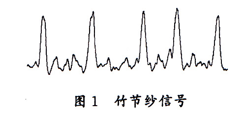 竹节纱用于在织物中添加特殊的效果,这一效果的添加通常比较随意,决定了竹节纱的多样性和富于变化性,对竹节纱进行质量控制需要从比较随意的设计中找到规律,对生产的竹节纱进行质量判定。竹节纱中竹节的长度和幅度是否在设定的范围内、竹节间距的分布是否符合要求、竹节纱中有无影响整个布面效果的因素都是竹节纱质量控制的关键。将竹节纱在 条干仪上进行测试,得到了竹节纱通过电容式检测头时所感应出来的信号(图1),可以看到,信号上存在很多突起,从整个纱线信号中检出竹节部分,统计竹节和竹节间距,计算用于评价竹节纱质量的各项性能指标,判断竹节纱是否在设定的范围内,是建立竹节纱质量控制模型的基本思路。