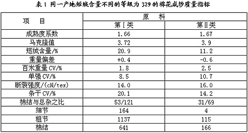 从表1可看出,当原棉产地相同、等级相同、物理性能接近时,仅由于短绒含量不同,从而造成成纱的质量差异明显。如表1的试验数据结合表2的评等条件以及评定原则看,第Ⅰ类329单唛试纺的27.8 tex纱最低的为1克内棉结杂质粒数121粒和条干均匀度变异系数20.9%,分别多于和大于一等纱的标准120粒和19.5%,即被评为二等,最后综合评定为二等纱;第Ⅱ类的329单唛试纺27.8 tex纱为棉结杂质粒数69和单强断裂强力变异系数10.7%,分别多于和大于优等的标准60粒和10.0%,即被评为一等纱,最后综合评定为一等纱。
