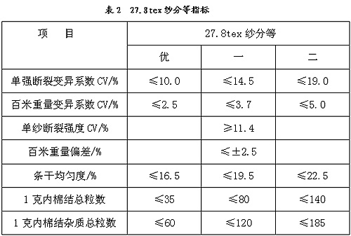 GB / T 398 - 1993《棉本色纱线”规定:1)棉纱线的品等分为优等,一等,二等,低于二等指标者视为三等;2)棉纱的品等由单纱的断裂强力变异系数简历(%),百米重量变异系数简历(%),条干均匀度简历(%),1克内棉结粒数及1克内棉结杂质总粒数评定;3)单纱(线)的断裂强度或百米重量偏差超出允许范围时,在单纱(线)断裂强力变异系数简历(%)和百米重量变异系数简历(%)原评等的基础上作顺降一个等级处理,降至二等为止。GB/T 398-1993“纱”。