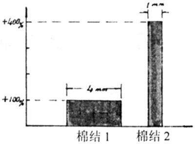 对棉结的另一解释是,比较两个具有理想尺寸的棉结以1毫米作为参考长度,即灵敏度水平设定为+ 400%(相对1毫米长度而言)对长度为4毫米而截面超出纱线平均截面的200%(相应灵敏度水平为+ 100%),两种棉结是等价的同样给予计数。参看图1,具有理想尺寸的棉结1与棉结2等价,即当棉结灵敏度水平设定为+400%时,两种棉结同样给予计数。4毫米。