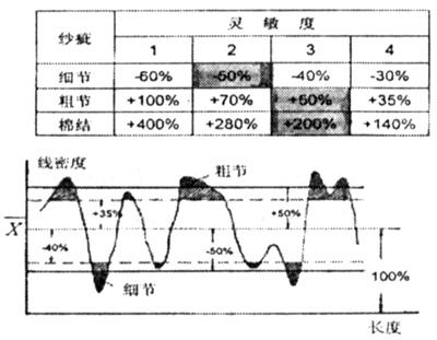 用条干仪测试纱疵时有四档灵敏度供选择(1、2、3、4档)。例如,灵敏度+50%是指纱线截面等于或大于平均截面的150%;灵敏度-40%是指纱线截面等于或小于平均截面的60%,参看图2。灵敏度档数增高,纱疵数也增多。