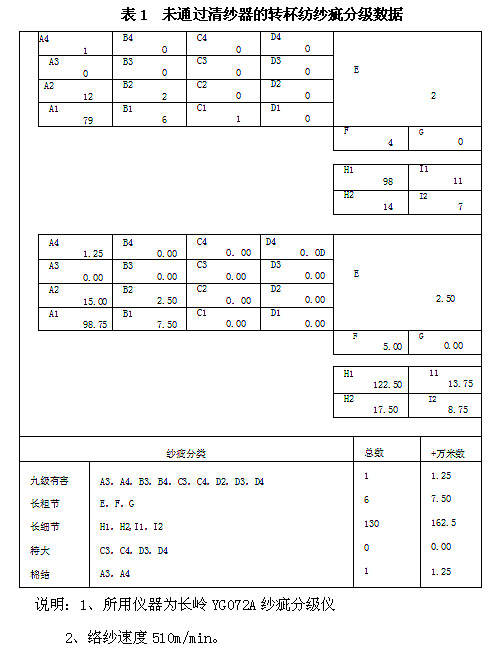 转杯纺纱机产生偶发性有害纱疵的原因很多,如配棉对成纱质量的影响,温湿度对成纱质量的影响,设备状态(主要为纺杯、分梳辊、阻捻盘)对成纱质量的影响等。利用清纱器所清除的纱疵进行分析,可以找出一些由于机械状态原因所产生的纱疵。