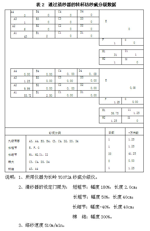 转杯纺纱机安装清纱器后有害纱疵明显减少,为企业带来经济效益,表1和表2是浙江某企业在泰坦TQF268上纺30支粘胶纱线时,通过长岭精锐30电子清纱器和未通过清纱器的纱线在纱疵分级仪上的实验报告数据,表1是未通过清纱器的纱线分级数据,表2是通过清纱器的纱线分级数据。从两个表数据对比来看,通过清纱器的纱线短粗节、长粗节纱疵减少,特别是在纺粘胶时容易形成的细节纱疵大幅度减少,清除纱疵效果较为明显。