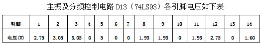 与D13 (74 ls93)的正常数据对比发现该芯片1脚及12脚电压异常,高出正常值0.8 v左右,正常工作时应与8,9,11脚三点电压相同约为1.93 v。