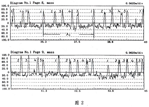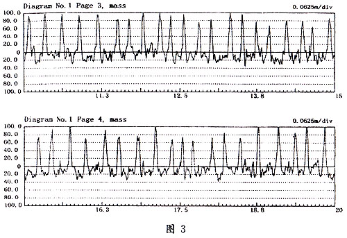 根据不匀曲线图可以统计竹节的数目,从而确定平均每米有多少个竹节。图1所示在约5米长度内有14个竹节即平均每米约2.6个竹节。