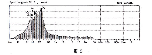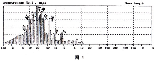 1. 多序竹节纱如图2所示的五序竹节纱其波谱图见图4。该纱一周期内分布有五个不同节距的竹节,主波波长λ1≈1.8米并伴有达数十次的丰富谐波,构成有固定波长的一大片”烟囱”。