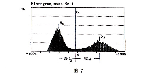 根据线密度频率分布图上的,t, s在横轴上的位置确定t, s相对于偏移的百分数,从而得出线密度增加倍数即倍粗= s / t。取竹节纱以图7为例,平均线密度的相对值= 100(%),则基纱平均线密度的相对值t = 100 - 36.5 = 63.5(%),竹节部分平均线密度的相对值s = 100 + 50 = 150(%),由此可得倍数= s / t = 150/63.5≈2.36倍,该值反映了竹节的相对粗度,其可影响布面的凹凸立体感风格。