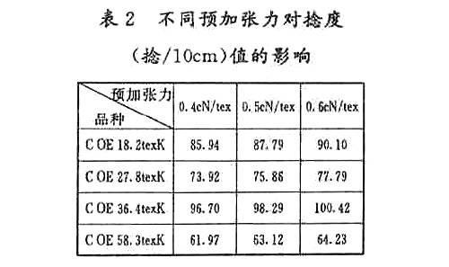 预加张力作为转杯纺纱捻度测试中的一个重要参数,测试方法标准规定预加张力皆为0.5±0.1 cn /特克斯,对于一个具体的转杯纺纱品种,应该选0.5 cn /特克斯,还是0.6 cn /特克斯或0.4 cn /特克斯,标准中没有作出规定。由于预加张力选择不同,由此会造成捻度测试结果的差异,从而影响检验结果的准确性与可比性。。检验结果见表2。