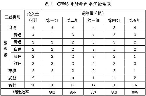 这是一个很好的例子。表1是产品改进后用户的实验数据。在棉花充分开松的条件下,采用最小尺寸面状为1厘米2线状为40毫米×2毫米的各种异纤混合后,从前级开棉机出口投入棉流,进行检出率试验,试验结果如表1所示。