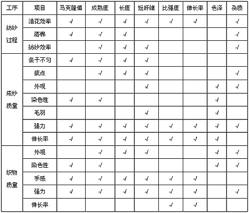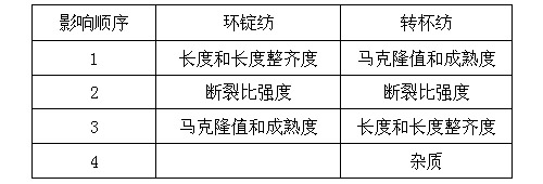 一般说来细度、长度、强力较好的原棉,能够纺织出较细、强力和条干较好的纱,同时能够减少断头,提高纺纱的效率。试验证明,在环锭纺中长度和长度整齐度对成纱强力的影响约占42%,断裂比强度约占20%,马克隆值约占15%。转杯纺中长度和长度整齐度约占29%,断裂比强度约占24%,马克隆值约占14%。由此可见转杯纺对长度方面的要求比环锭纺要低。原棉对环锭纺和转杯纺的纺纱工艺的影响顺序见表6。
