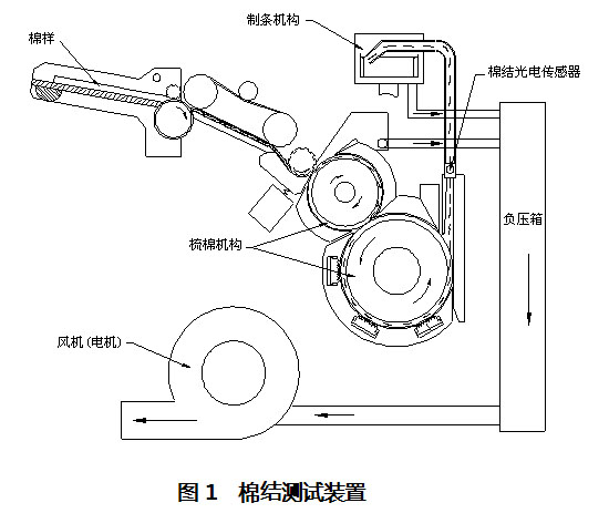 棉结测试装置如图1所示。在测试时,棉条(或原棉)被按照一定操作方法送至分梳辊(开松辊)上。分梳辊高速旋转,梳针将喂入的棉花进行开松,梳理、除杂后,形成近似均匀单纤维流。在负压的作用下,纤维流进入高速转杯形成棉带。