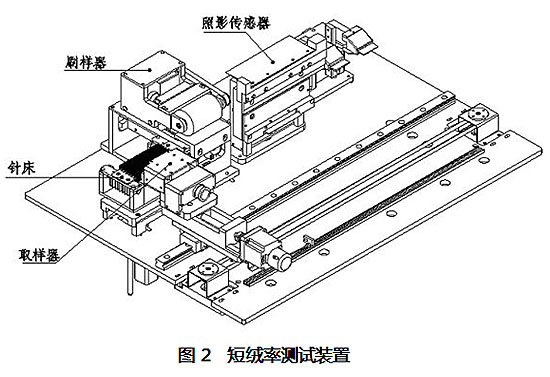 其测试过程为:测试时,梳床(针床)自动弹出。将棉条正反交错均匀分布横压入针床(例如棉条,直接压入6次,正反棉条各3次),用压棉板压入按平,扯去靠近取样器端多余的纤维,开始测试。针床下降,进给电机前进,取样器夹口夹取棉花;取样器后退,打开夹口,负压机构从取样器后端把废棉吸走。进给电机每次前进微小距离循环整理取样6次(可设置),最后一次进给量增大,夹取试样棉束。取样器后退,运行到刷样器位置,向刷样器靠近。刷样器向取样器靠近,旋转并刷掉须从杂物和游离纤维,回置原位。取样器后退,运行到照影传感器位置,靠近光电照影传感器。光电传感器后端产生负压气流,使须从平直进入照影传感器窄缝进行传感器扫描。扫描完成后,取样器夹口张开,负压气流从夹口后把废棉吸走。取样器恢复原取样整理位置。传感器信号送计算机处理,完成一次测试。