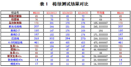 其中,MN100测试数据为每种试样测试3次的平均值;XJ129棉结每个测试结果为每种试样测试4次的平均值,按照顺序测试了3轮,最终取三轮测试数据的平均值(每种试样测试共测试12次)。