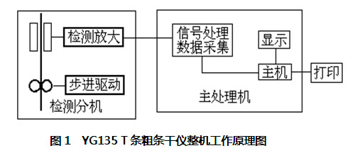 试样以一定的速度受罗拉牵引通过检测槽,将其单位长度的质量(线密度)的变化转化为相应的电信号,经放大后,送到信号调理板进行均值调整,然后进入数据采集卡进行高速采样。