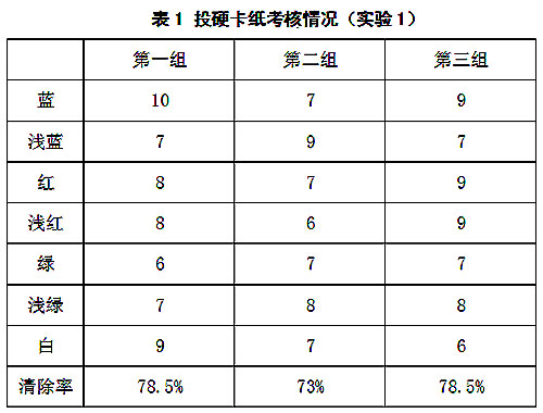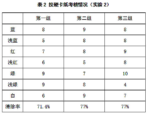 CS808棉花异纤清除机目前在某厂家做实验使用5个多月,现场产线为圆盘机,开松效果不如清梳联,并且每天检测的棉花品种都不同,且差异较大,因此根据现场情况创建多个分类器,不同的分类器设置不同的算法参数,满足配棉频繁变化的需求。投掷样本为硬卡纸,长度为40毫米×2.0毫米的七种纸条(红,绿,蓝,浅红,浅绿、浅蓝,白色荧光)混合后,在距离检测通道前正中间开一个8毫米小孔,在棉花通过检测区域时,在该小孔投放样本,投放完毕后从废棉中检出投放样本,试验结果如表1和表2所示。