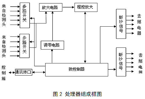 一个处理器可以同时处理24/16锭纱信号。每个处理器主要由纱线信号放大电路、增益控制电路、零点补偿电路、微控制器、检测头灯驱动电路、继电器驱动电路、串行通信电路、电压检测电路、稳压电路等组成处理器的作用是把来自检测头的纱线信号,通过自动增益控制电路,放大到规定的电平值。纱油气田油气田a / d,纱油气田油气田油气田油气田,油气田油气田,油气田,油气田并且将处理结果通过串行方式送到控制箱。当纱疵达到清除规定时,送出断纱指令停止喂棉。处理器组成框图如下(图2)。
