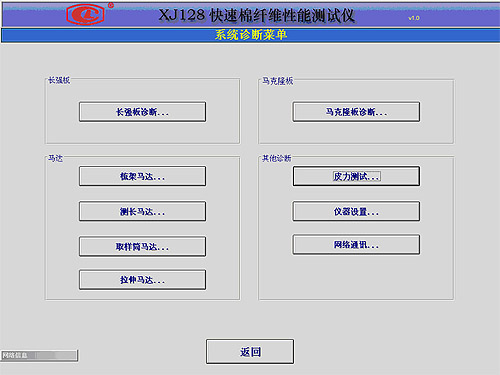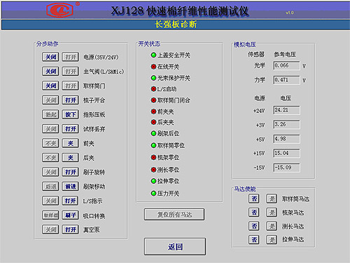 在XJ128正常待机的情况下,进入“XJ128快速棉纤维测试仪”执行软件,在主菜单上点击”系统诊断”按钮,可进入系统诊断菜单界面;点击“长强板诊断…”按钮,即可进入长强板诊断界面。