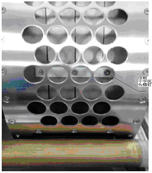 将新的四指压板按照旧零件的安装关系放入取样筒,注意:取样筒中橡胶板应在四指压板的上侧,四指压板折弯头应朝后侧。然后点击“指形压板-按下”按钮,四指压板在外力作用下按下,注意与压板连接的零件不能翻转到后侧,如果位置不正确,应该重新操作。然后上下左右调整四指压板的位置,使四指压板的三个过孔正对压板连接零件的螺纹孔。再将压板从多孔不锈钢取样板的孔中塞入,慢慢调整其位置(可以用比较细的内六角根据作为辅助工具)对正过孔。最后用十字螺丝刀吸附着十字沉头螺钉旋入螺纹中,三个螺钉(如果螺钉有损坏,可以更换附件中的同规格新螺钉)全部安装好后,四指压板更换基本宣告结束。