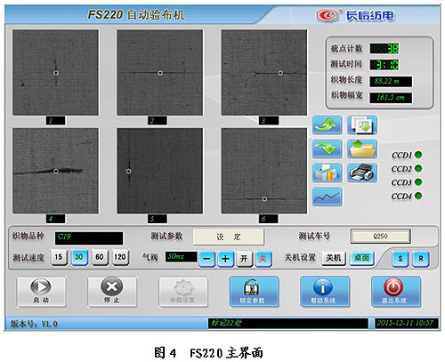 FS220监控识别软件是整个系统的核心,包括参数设置,结果查询,测试,自检,帮助系统等功能。其中参数设置包括与识别相关的设定参数、速度参数、气阀状态及幅宽设定等。参数可以按照品种进行保存,参数的修改通过密码进行保护,只有纺织企业工艺管理人员才能有权限进行参数的修改,而操作人员只需按照存储的品种重取参数即可。自检可以检查视觉系统、通讯、标记系统等,方便维修。主界面如图4所示。