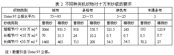 节。常发性纱疵短而小,小而多,一般对后工序的加工和织物影响不大,通常不易清除彻底,但对高档织物也必须控制常发性纱疵的数量。偶发性纱疵一般都表现为粗大、长细,该类纱疵通常是由于生产管理不善、操作不良、工艺设计不合理所致。该类纱疵大而少,但对后工序和织物质量影响显著,所以必须清除。