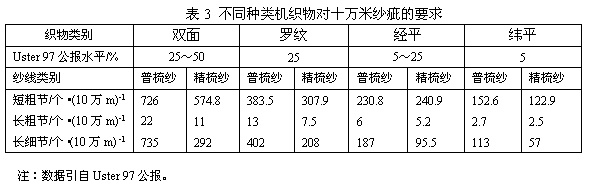 表3数据说明,针织物十万米纱疵数据相对于机织物而言对大长疵点(大肚纱)、细长疵点要求严格,对纬平组织要求最高,对经平组织相对于纬平组织要求略低,罗纹组织对纱疵的要求又比前面两种经平和纬平低。双面组织对纱疵有一定的掩盖性,因而对纱疵要求较松。精梳纱的纱疵在大、长细疵点方面较普梳纱数据朋显严格,同时针织物对纱疵的要求整体数量少,无论是小短纱疵或是长细纱疵均是如此,如果针织物基本反映没有纱疵,此类棉纱机织物(除米通条织物之外)一般是不存在问题的。米通条织物在一定程度上对纱疵的要求此纬平针织物要求更高,尤其表现在短粗节、长粗节方面。所以米通条织物、纬平组织是机织物和针织物中对十万米纱疵各级疵点要求较高的两种织物组织。根据各类织物的组织特点,确定纺纱纱疵数量有利于对棉纱纱疵进行控制和分类。