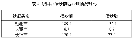 对于纱疵的清除,必须根据十万米纱疵的分布及数量,找到原料纱疵、牵伸纱疵、操作管理纱疵产生的根源,在生产过程中加以控制。不能完全依赖电子清纱器清除纱疵,要根据织物要求决定合理的成纱质量,摸清不同织物组织对纱疵的要求来调整电子清纱器参数,以减轻电子清纱器的压力。一般来说米通条织物、针织单面平针织物均要求十万万米纱疵在乌斯特97公报5%水平以内,这两种织物使用的棉纱要求电子清纱器对短粗节、长粗节、细节的大小、长度等参数的设置要严格。相对而言,绒布、条格布、针织罗纹组织、双面组织对十万米纱疵要求较松,对原料纱疵数无须严格要求,对于大部分短粗节、小的细节可以保留于筒子纱内,络筒机电子清纱参数可适当放大。对于质量要求不高的棉纱,电子清纱器的主要作用是去除粗而大、长而细的纱疵;对于质量要求较高的棉纱,电子清纱器的主要住用是去除部分棉结和短小粗节,包括对原料纱疵的清除,相对而言电子清纱器的清疵负荷加重。针织纬平织物用棉纱清纱前后纱疵情况对比见表4。纱。