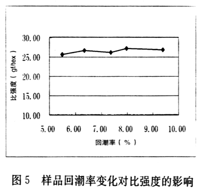 在不同的环境条件下分别对棉样进行予调湿,然后测其比强度,比强度与回潮率的关系见图5。